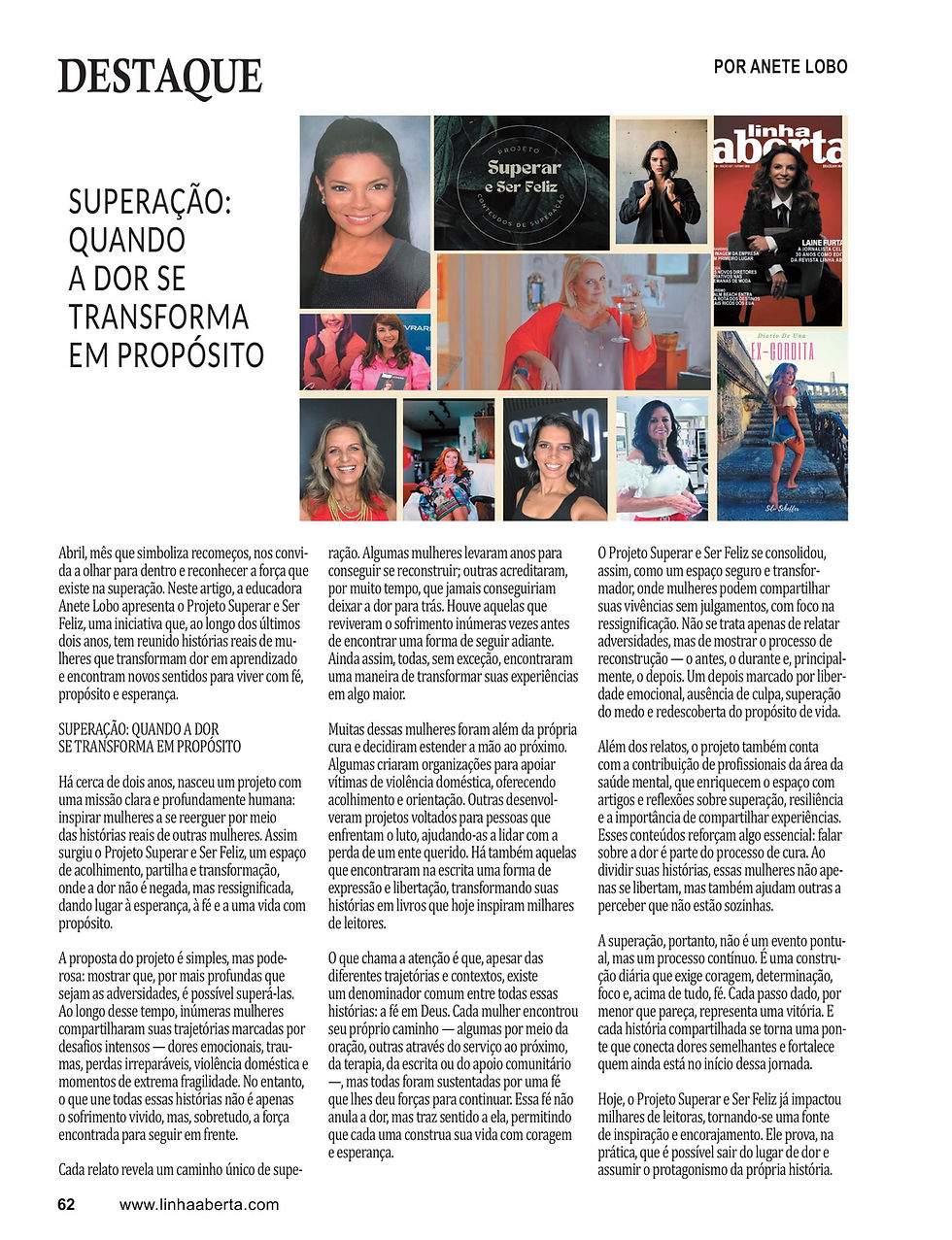 O Projeto Superar e Ser Feliz tem como propósito motivar mulheres em sua superação pessoal através de histórias vindas de outras mulheres que passaram por traumas, depressão, luto, risco de vida, abuso, ou outro sofrimento qualquer. O objetivo é que através de histórias inspiradoras de pessoas comuns que venceram adversidades, outras mulheres possam olhar para sua própria dor e entender que existe uma luz no fundo do túnel.